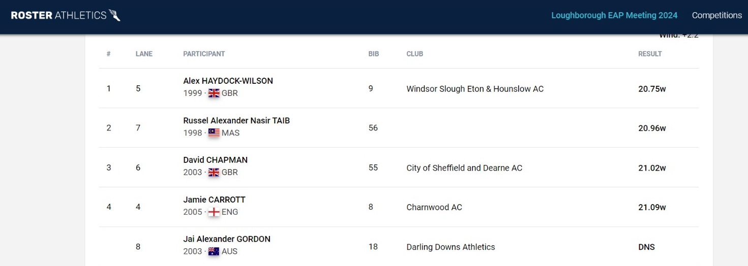 Russel was proud to take a silver whilst flying the flag for Malaysia at one of the homes of Great British athletics and also to dip under 21 seconds but in equal measure ultimately frustrated to not have the race deemed wind legal being +2.2 so very unfortunate with wind conditions just over the permissible range! Not the first time this season to be thwarted by the uncontrollables on race day variables with the weather conditions.